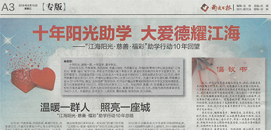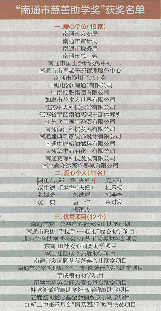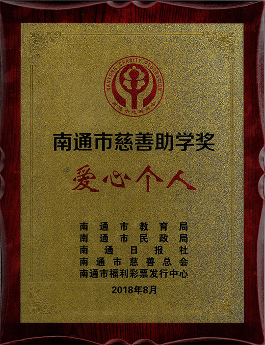 2018年8月15日,南通市教育局、南通市民政局、南通日?qǐng)?bào)社、南通市慈善總會(huì)、南通市福利彩票發(fā)行中心公布了“南通市慈善助學(xué)獎(jiǎng)”評(píng)選結(jié)果,南通三圣石墨設(shè)備科技股份有限公司董事長馮圣君、鄭輝夫婦榮獲“南通市慈善助學(xué)獎(jiǎng)愛心個(gè)人”光榮稱號(hào),全市僅有11人獲此殊榮。